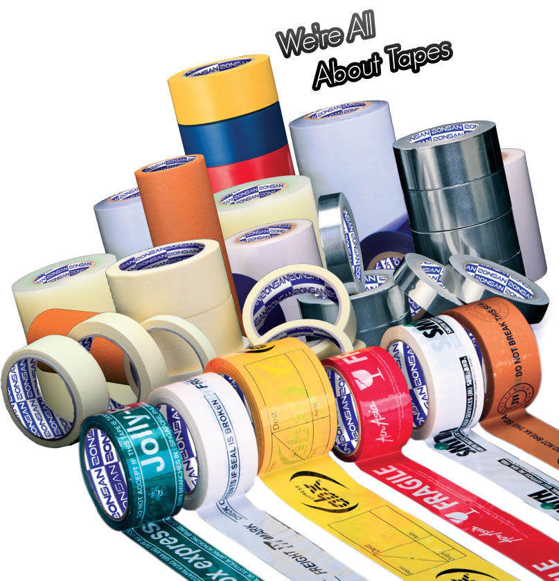• Acrylic Foam Tape • Aluminum Foil Tape • BOPP Printed & Color Packaging Tape • OPP Laminating Film • OPP Packaging Tape • Cloth Tape / Duct Tape • Double Sided Tissue Tape • Double Sided Foam Tape • Filament Tape • Floor Marking Tape • Hard PVC Tape • Masking Tape • Paper Gummed Tape Dispenser • Printing Plate Mounting Tape • Reinforced Paper Gummed Tape • Silicone Kraft Paper Tape (SKPT) • Stationary Tape • Stretch film - Hand Roll, Machine Roll, Mini Roll • Strapping Band - PET & PP • Surface Protection Tape • Teflon Tape • Other Specialty Tape: Customize to your needs.